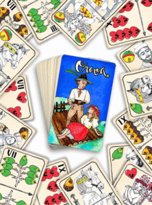 Zaujímavo sme vyobrazili esá. Tie sú tak trochu zhutnením ľudského bytia. Zobrazujú štyri ročné obdobia, ktoré symbolizujú čas v živote človeka. Jar poukazuje na veselosť detstva, leto na krásu a sviežosť mladosti, jeseň prináša plody múdrosti a zrelosti a napokon zima znázorňuje obdobie človeka, ktorý si svieti cez horizont do večnosti. Neobyčajné sedmové karty na hru a pobavenie sa Vám určite budú páčiť.