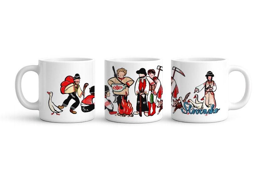 Motív s jemným humorom naznačuje, že jedlo a pitie dokážu aspoň na chvíľu pomôcť zabudnúť na každodennú „prácu“, nech je akákoľvek. Nápis Slovensko prirodzene prepája ilustráciu s domácimi legendami a ľudovým príbehom.