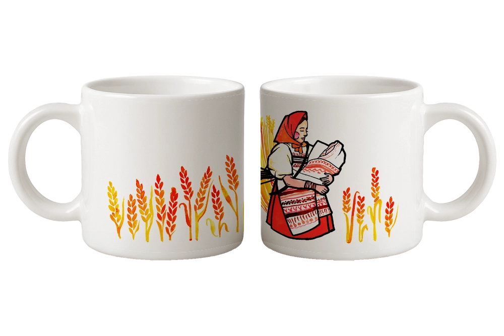 Táto presso šálka zobrazuje nežnú maľbu ženy v tradičnom kroji, ktorá v náručí drží zavinuté bábätko. Celý motív dopĺňajú jemné maľby klasov obilia, symbolizujúce život, hojnosť a pokračovanie tradícií. Nápis Slovensko dodáva šálke hlboký kultúrny a symbolický rozmer.