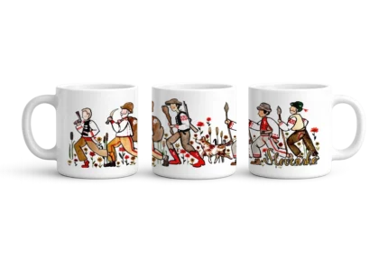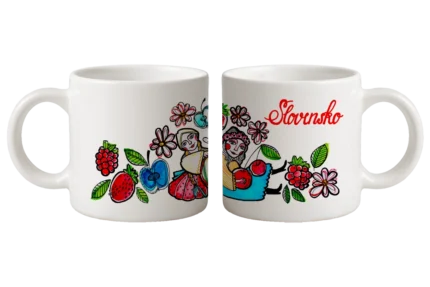 Presso šálka – Slovensko – žena v kroji s bábätkom a klasy obilia