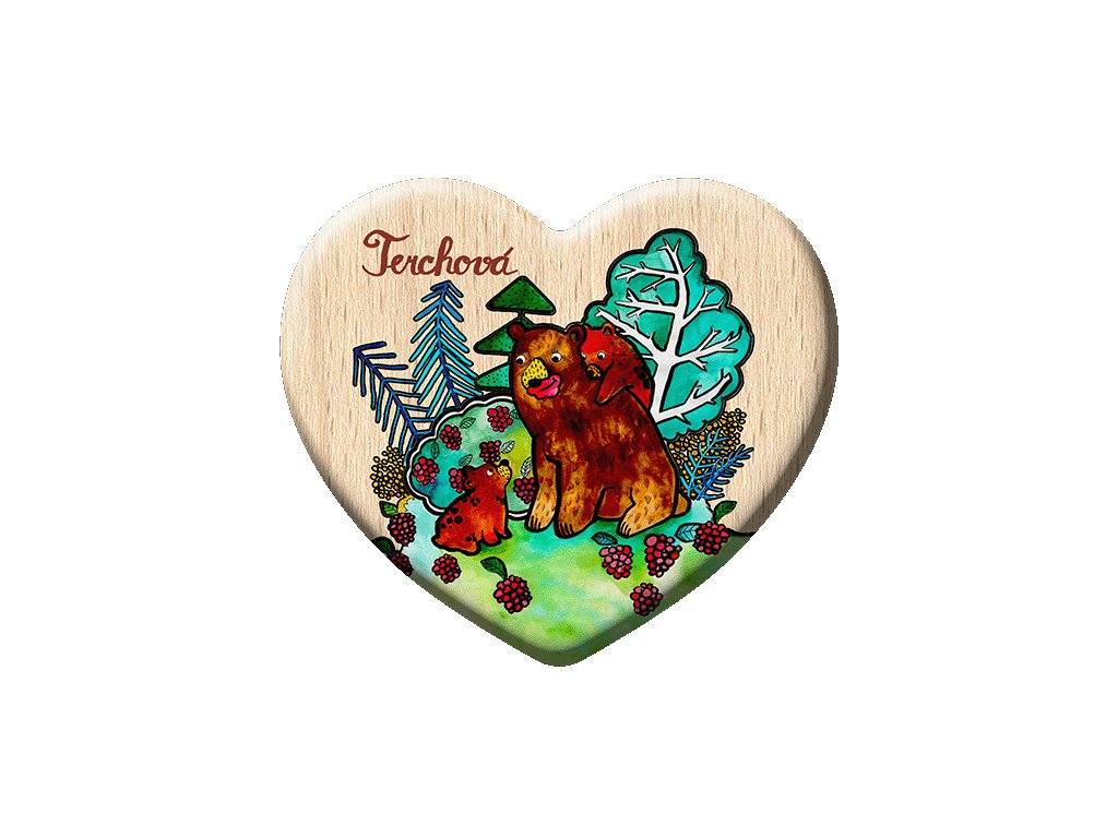 Drevená magnetka s medveďom, ktorý sa tu vyskytuje v hojnom množstve a nápisom Terchová. Magnetky sme vyrobili z bukového dreva a ručne opracovali, je v nich kus poctivej práce našich majstrov. O výzdobu sa postarali naši šikovní ilustrátori, ktorí ich návrhom venovali svoj čas a nápaditosť. Tak trochu sa snažiac vystihnúť niečo z danej lokality a vniesť to na kúsok zušľachteného dreva.