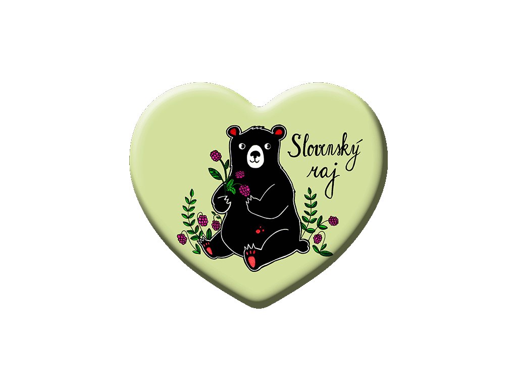 Drevená magnetka s medveďom v malinisku, ktorých je na Slovensku nespočetné množstvo obveselí nejedného milovníka prírody. Týchto huňatých mackov je aj v Slovenskom raji neúrekom. Magnetky sme vyrobili z bukového dreva a ručne opracovali, je v nich kus poctivej práce našich majstrov. O výzdobu sa postarali naši šikovní ilustrátori, ktorí ich návrhom venovali svoj čas a nápaditosť. Tak trochu sa snažiac vystihnúť niečo z danej lokality a vniesť to na kúsok zušľachteného dreva.
